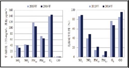 16個城市空氣質量年均值達標,145個城市空氣質量超標 2014年新標準第一階段監測實施城市平均濃度和達標城市比例年際比較 2014年全國省界斷面水質狀況 2013年全國縣域生態環境質量分布示意圖 環境保護部今日向媒體通報了《2014中國環境狀況公報》。公報指出,2014年,在黨中央、國務院的高度重視下,生態文明建設和生態環境領域改革取得積極進展,大氣、水、土壤污染防治邁出新步伐,主要污染物總量減排年度任務順利完成,環境保護優化發展的綜合作用繼續顯